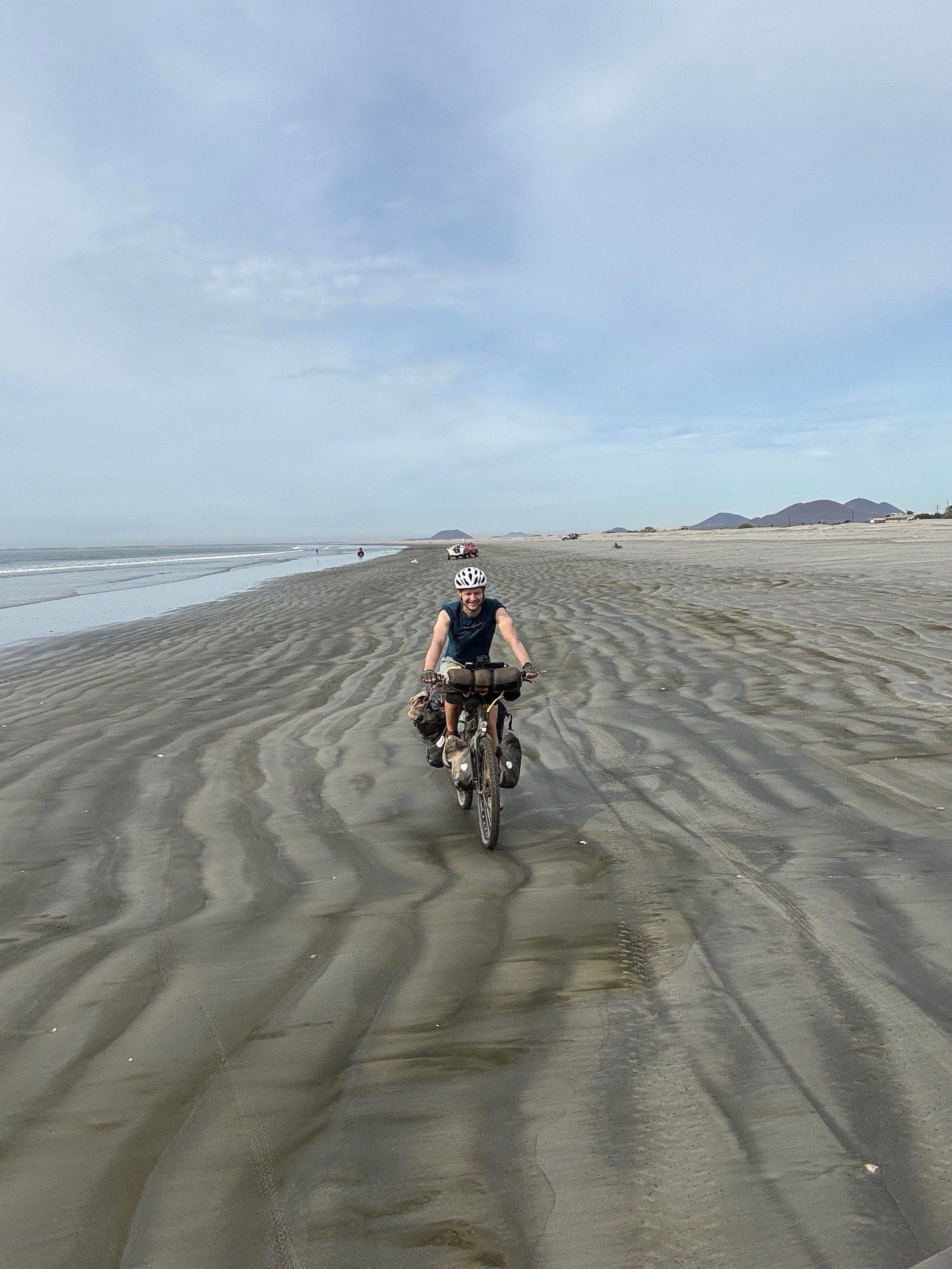 After successive days at the sea-side towns of Camalú, Vicente Guerrero, and San Quentin, I rode back into the mountains with my companion, Andre, for what would be two days of difficult and slow mountain riding. Leaving San Quentin, back roads adjacent to huge farms eventually led to the beach where we rode for several miles over the damp, compact sand alongside the Pacific Ocean.
