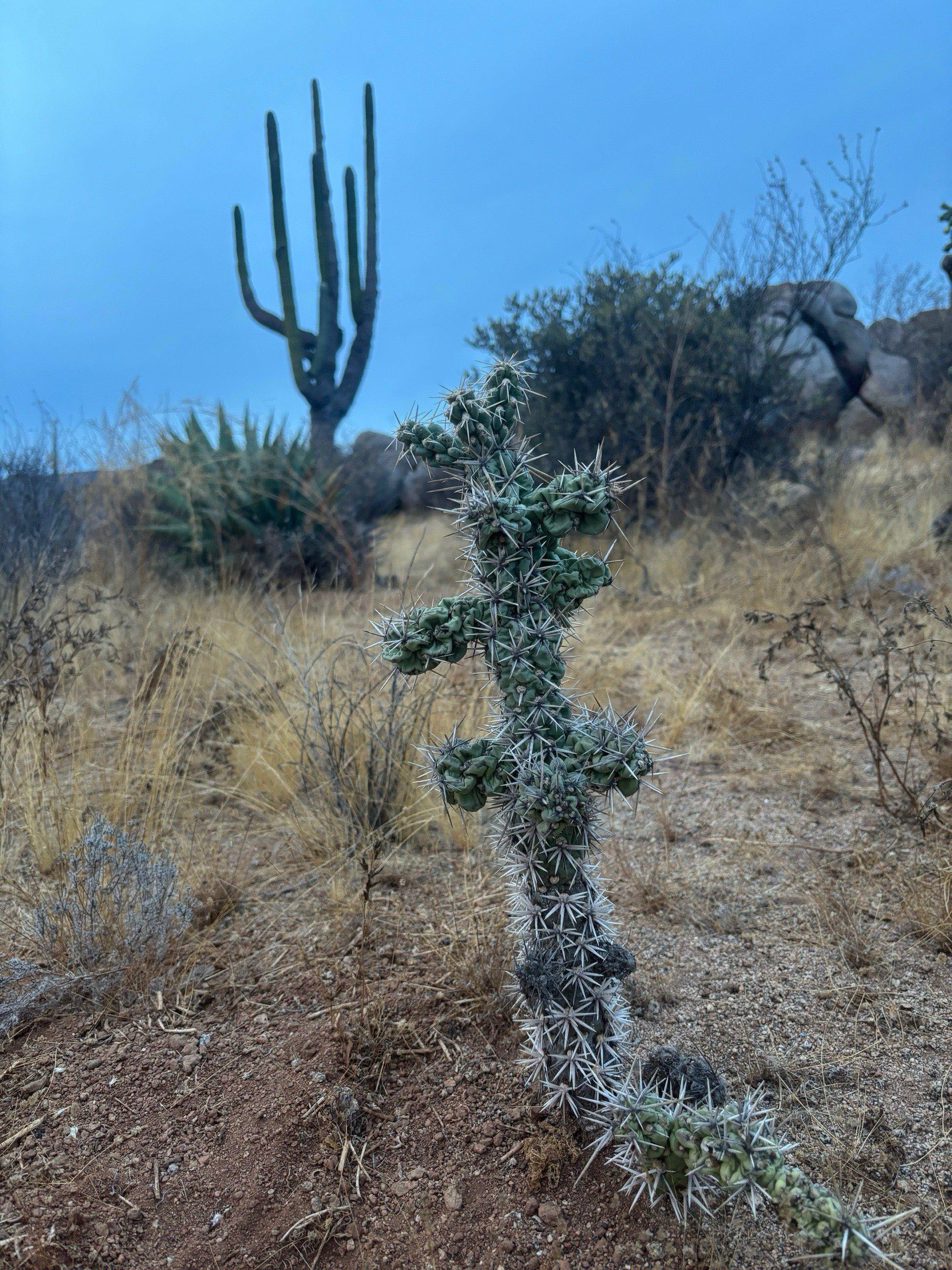 The dirt roads of the foothills very quickly transformed into nearly unrideable rocky track. Thanks to the recently completed Baja 1000, the track was barely passable especially on 2.1" tires. Progress was frustratingly slow as I rode at my lowest gear and spent several hours intensely concentrating at avoiding the worst of the jagged rocks and narrow dirt sidewalls of the trail. Unfortunately, one lapse in concentration sent me flying of the side of the bike into a cactus with nearly inch long spines. I was able to emerge from the bush, but not unscathed as I picked out hundreds of spines from my arm and leg, and later with Andre's help, my back. The kind of cactus I fell into is pictured below!