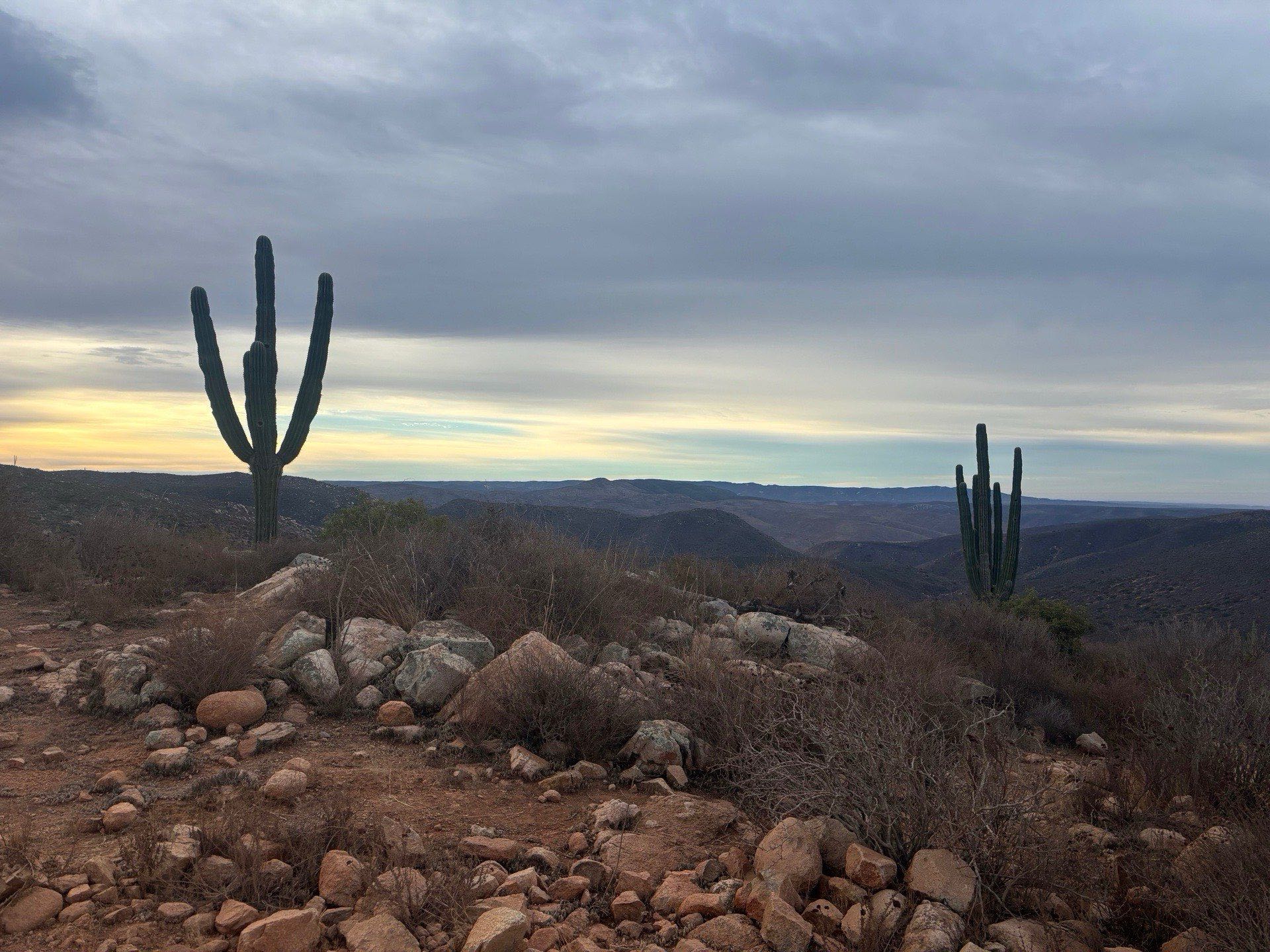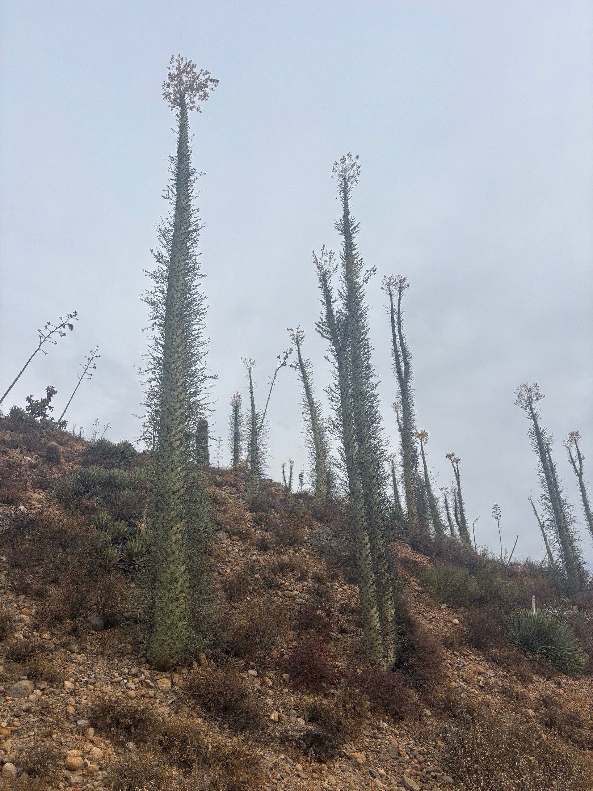 After hours of climbing and pushing the bikes up the mountain, we began a glorious descent that still was at times hazardous due to the embedded stone where falling would feel a bit more like flying over the side of a cliff if we weren't careful. We rode into the valley and were amazed by the tens of thousands of cactus and Boojum Trees (pictured below) that dotted the landscape. The Boojum Trees are nearly endemic to Baja California and are some of the slowest growing trees on the planet, growing only 5 feet in 50 years and then 12 inches every 10 years thereafter.